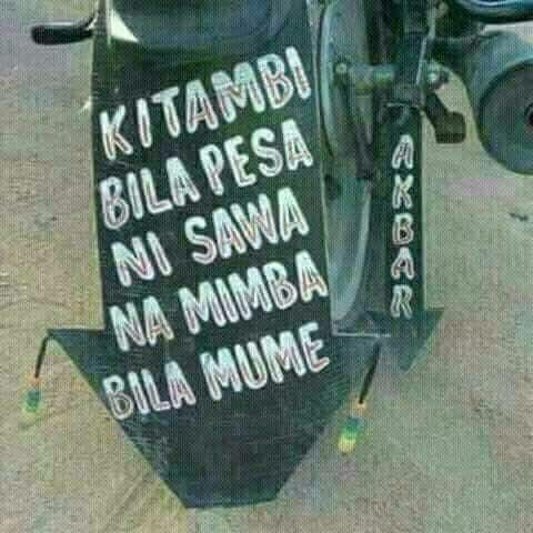 Ayo ni amwe mu magambo aba yanditse ku makamyo aturuka mu bihugu bituranye n’u Rwanda bikoresha ururimi rw’Igiswahili. Aho ngo ntawagombye kubyibuha mu gihe afite ideni ry’abandi.