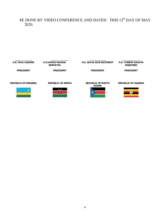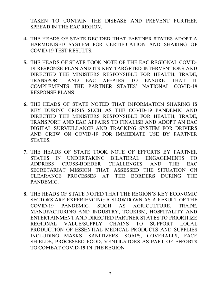 Uyu ni umwe mu myanzuro yavuye mu nama yahuje abakuru b’ibihugu bigize umuryango wa Afurika y’Uburasirazuba, yabaye kuri uyu wa kabiri tariki 12 Gicurasi 2020. Inama yari igamije kwiga ku buryo bwo guhangana n’icyorezo cya COVID-19 muri aka karere, ikaba yabaye hifashishijwe ikoranabuhanga rya Video conference mu rwego rwo kwirinda icyorezo cya COVID-19.