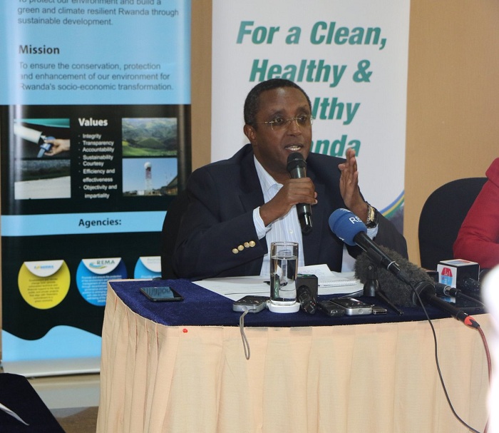 Minisitiri ufite ibidukikije mu nshingano ze, Vincent Biruta, ndetse na Eng. Coletha Ruhamya, Umuyobozi Mukuru w’Ikigo REMA gishinzwe kubungabunga Ibidukikije, kuri uyu wa 22 Gicurasi 2019, bagiranye ikiganiro n’abanyamakuru ku iyangirika ry’umwuka mu Rwanda, abo bayobozi basobanura ko riterwa na bimwe mu bikoresho bisohora umwuka uhumanye.