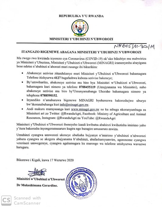 Minisiteri y’Ubuhinzi n’Ubworozi na yo yatanze imirongo ya telefone kimwe n’urubuga rwa internet abayikeneyeho amakuru bashobora kwifashisha, ndetse n’ahanyuzwa inyandiko n’amabaruwa mu buryo bw’ikoranabuhanga ku bayikeneyeho serivise.
