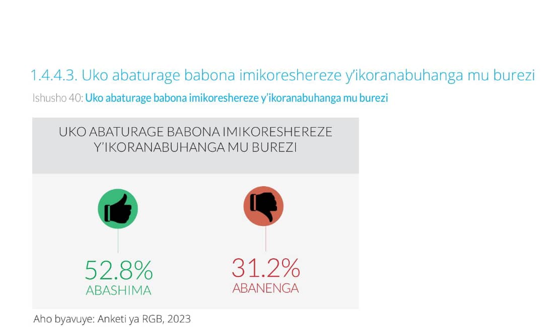 Ubugenzuzi busanzwe bukorwa n’urwego rw’Igihugu rushinzwe Imiyoborere RGB, mu Kuboza 2023 bwagaragaje ko mu Rwanda Akarere ka Kicukiro ari ko kaza ku mwanya wa mbere mu gukoresha ikoranabuhanga ku ijanisha rya 82% kavuye kuri 81.7% muri 2022, Akarere ka Rubavu kaza ku mwanya wa kabiri na 81.1% kavuye kuri 72.7% naho Akarere ka gatatu ni Nyarugenge ifite 80.9% ivuye kuri 83%.