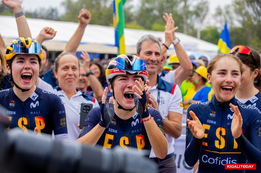 Abakobwa b’Ikipe y’Igihugu ya Espagne bitabiriye Shampiyona y’Isi ry’Amagare 2025 i Kigali, ibyishimo byabarenze bararira, nyuma y’intsinzi ya mugenzi wabo Paula Ostiz, wabaye uwa mbere mu batarengeje imyaka 19, ku ntera y’ibilometero 74, yegukana umudali wa zahabu.