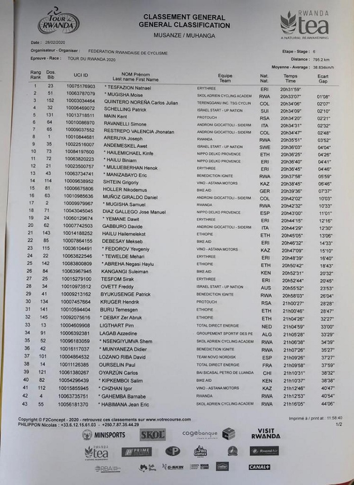 Umunya-Eritrea Tesfazion Natnael akomeje kuza imbere ku rutonde rusange, akaba akurikiwe n’Umunyarwanda Mugisha Moise uri ku mwanya wa kabiri.