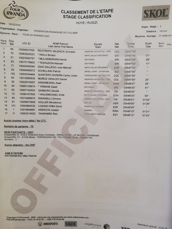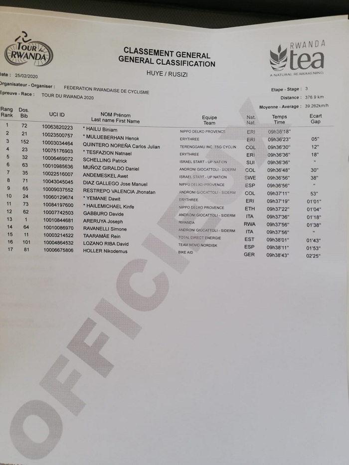Umurusiya Yevgeniy Fedorov wari wambaye umwenda w’umuhondo wambarwa n’uri ku mwanya wa mbere ku rutonde rusange na we yawutakaje, ufatwa n’umunya-Eritrea HAILU Biniam, waje ku mwanya wa kabiri kuri uyu munsi, no ku mwanya wa mbere ku rutonde rusange nk’uko bigaragara kuri iyi shusho ikurikira: