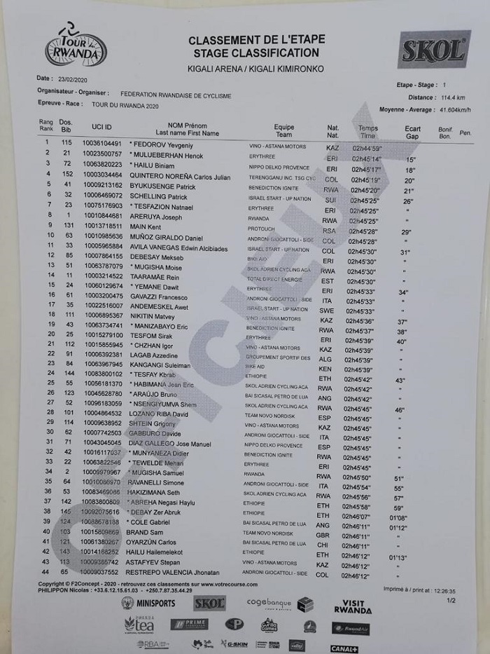 Umurusiya Yevgeniy Fedorov ukinira ikipe ya Vino-Astana Motors, yo muri Kazakistan, ni we wegukanye agace ka mbere ka Tour du Rwanda 2020, kavuye mu Mujyi wa Kigali kerekeza mu Karere ka rwamagana, abasiganwa basoreza ku Kimironko mu Mujyi wa Kigali.