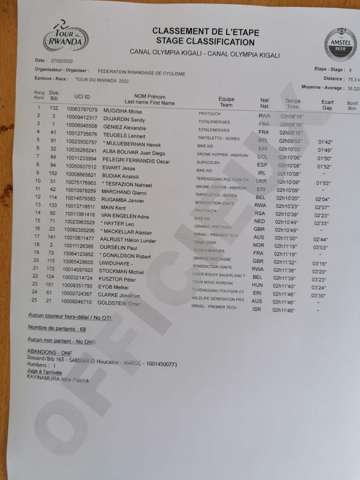 Kuri iki Cyumweru nibwo hakinwaga agace ka nyuma ka Tour du Rwanda 2022, aho kakinwe n’ubundi umunya-Eritrea Natnael Tesfazion ari we uyoboye urutonde nyuma y’uduce turindwi twari tumaze gukinwa.