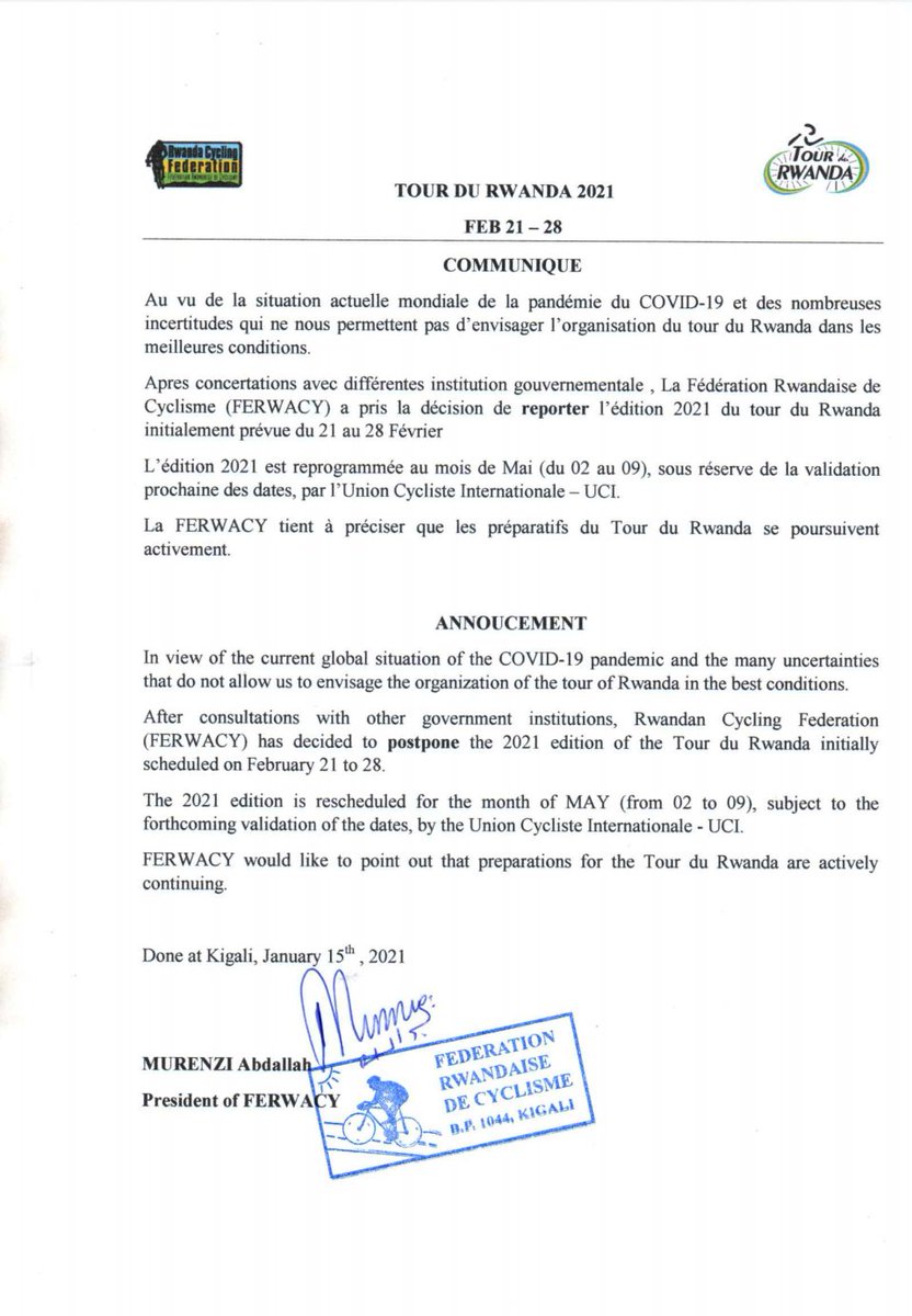 Ishyirahamwe ry’umukino w’amagare mu Rwanda (Ferwacy) rimaze gutangaza ko kubera ubwiyongere bw’icyorezo cya Coronavirus, iri siganwa ryimuriwe mu ntangiriro za Gicurasi.