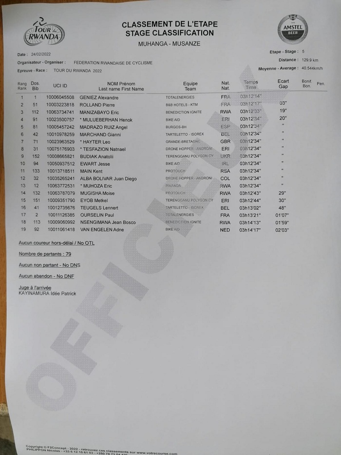 Bageze za Rusine, haje kwirema irindi tsinda ry’abayoboye isiganwa ryari rigizwe n’abakinnyi icyenda ari bo Madrazo, Laurance, Main, Mulueberhane, Hayter, O.Goldstein, M.Mugisha, Manizabayo na Restrepo Valencia