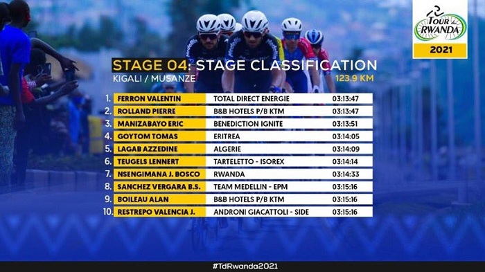 Valentin Ferron ukinira Total Direct Energie ni we wegukanye agace ka kane ka Tour du Rwanda 2021, ka Kigali-Musanze. Ku mwanya wa kabiri haje Pierre Rolland wa B&B, na ho ku mwanya wa gatatu haza Manizabayo Eric wa Benediction.