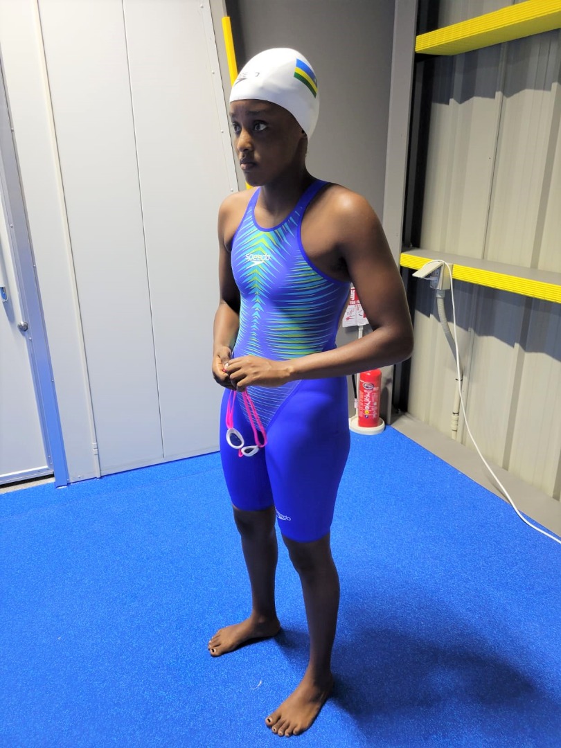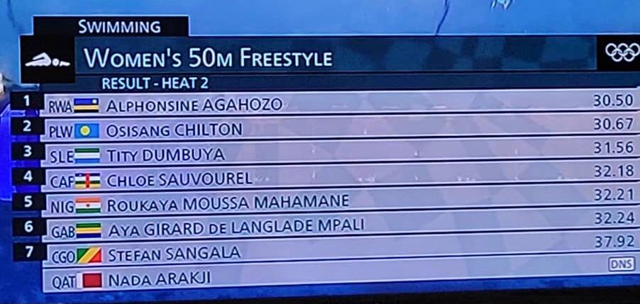 AGAHOZO Alphonsine wakinnye umukino wo koga ku ntera ya metero 50 (Free Style) yari yabashije kwitwara neza mu itsinda ry’abantu yakiniyemo, aho yaje ku mwanya wa mbere ariko harebwe ibihe andi matsinda yakoresheje ntiyabasha gukomeza mu kindi cyiciro