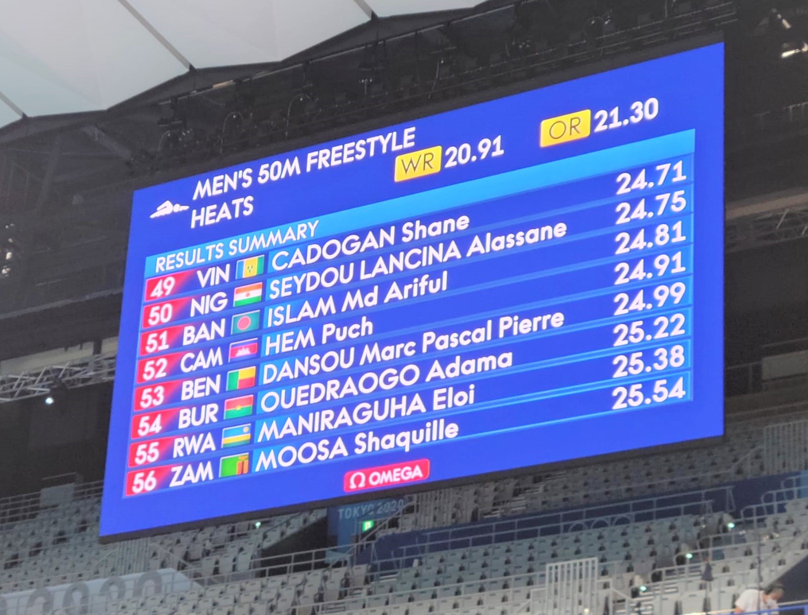 Mu mukino wo koga metero 50 mu bagabo, MANIRAGUHA Eloi yaje ku mwanya wa 7 mu bantu umunani basiganwaga mu itsinda rye, ntiyabasha nawe gukomeza mu kindi cyiciro.
