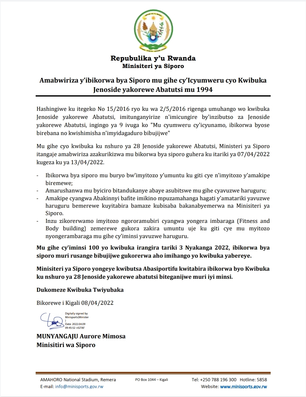 Mu gihe mu Rwanda turi mu cyumweru cyo kwibuka ku nshuro ya 28 Jenoside yakorewe Abatutsi mu mwaka wa 1994, Minisiteri ya Siporo yamaze gutangaza amabwiriza agaragaza ibikorwa bya Siporo bitemewe ndetse n’ibyemewe n’uburyo bigomba gukorwamo.