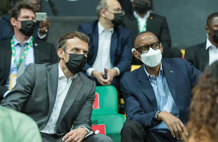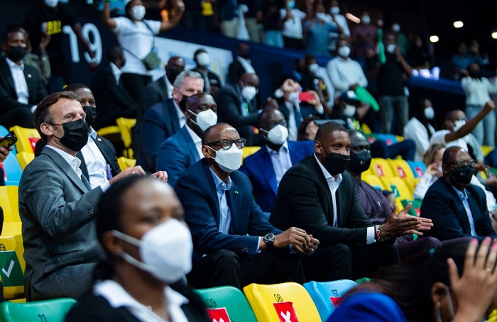 Perezida w’u Rwanda Paul Kagame na Perezida w’u Bufaransa Emmanuel Macron barebye umukino wa Basketball warangiye ikipe ya Patriots BBC yo mu Rwanda isezereye Feroviario de Maputo yo muri Mozambique.