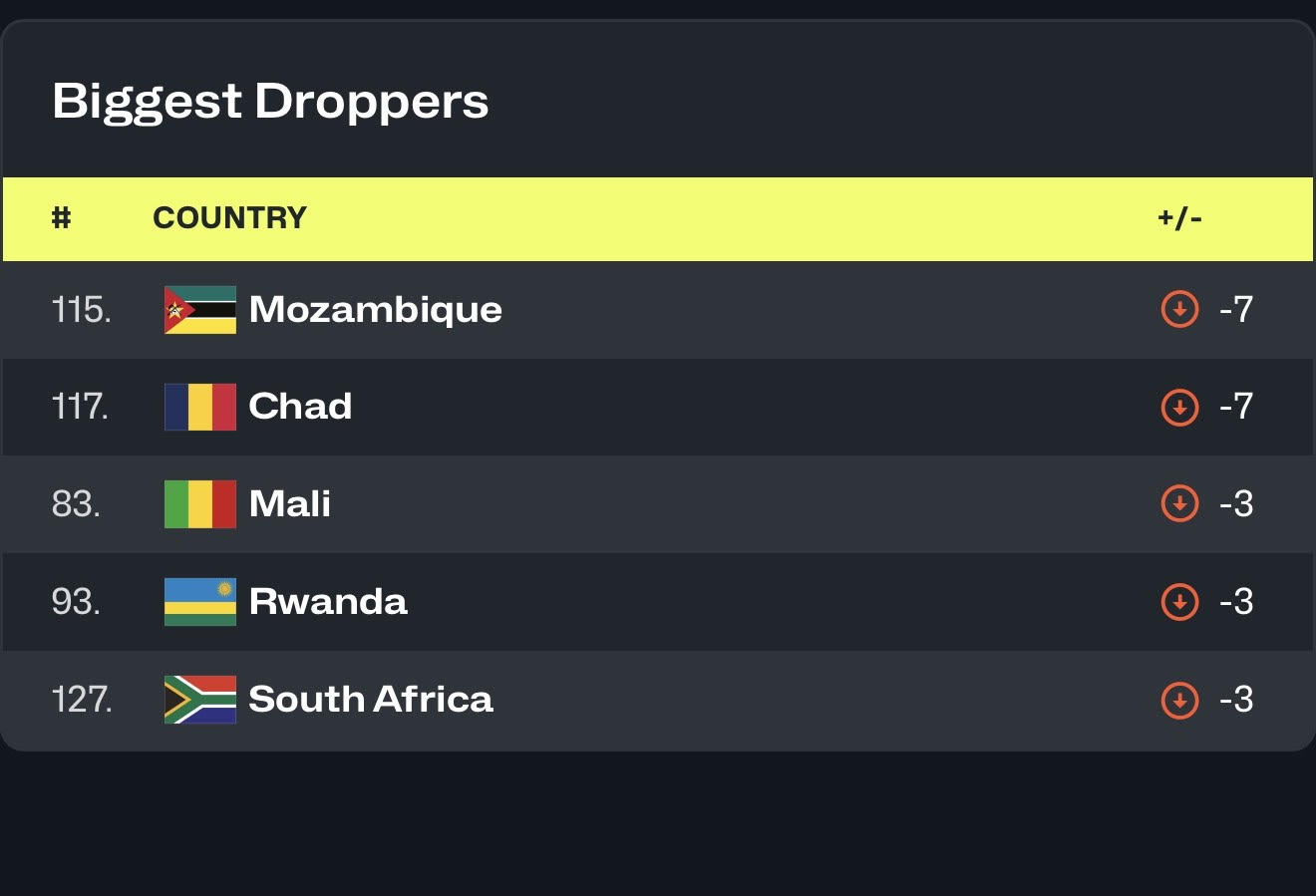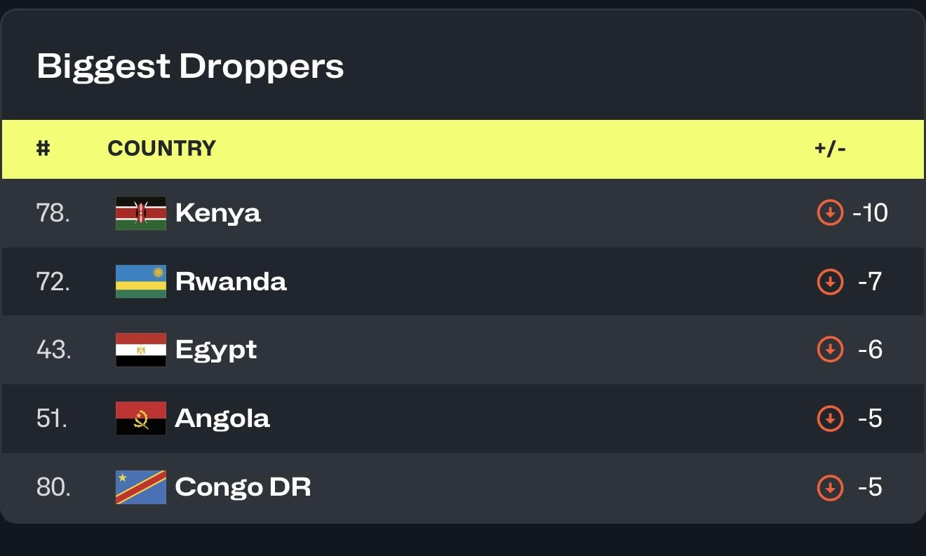 Mu cyiciro cy’abagore, u Rwanda ruri ku mwanya wa 11 muri Africa na 72 ku Isi, rukaba no mu bihugu nibura bitanu byatakaje amanota kuko rwatakaje 7.