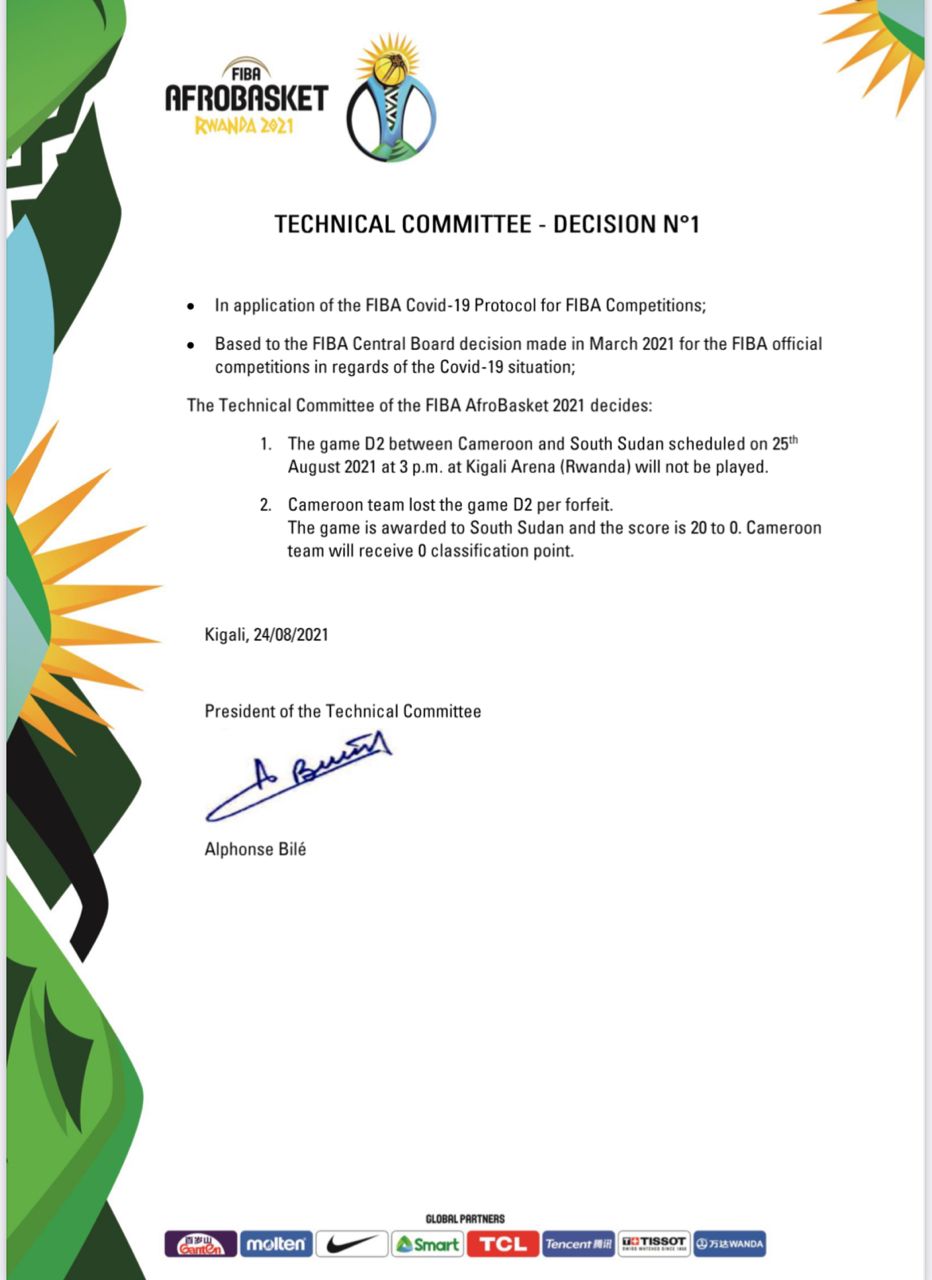 Mu mategeko y’ishyirahamwe mpuzamahanga ry’umukino wa Basketball “FIBA” agenga aya marushanwa, nyuma yo kuyasuzuma hafashwe umwanzuro wo gusubika uyu mukino ndetse Cameroun inaterwa mpaga y’amanota 20-0.