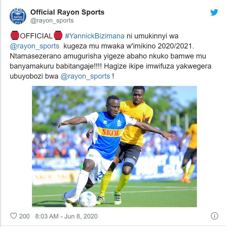 Ibinyujije ku rubuga rwayo rwa Twitter, ikipe ya Rayon Sports yahakanye aya makuru ivuga ko umukinnyi Bizimana Yannick akiri umukinnyi wa Rayon Sports kugeza mu mpera z’umwaka w’imikino wa 2020/2021.