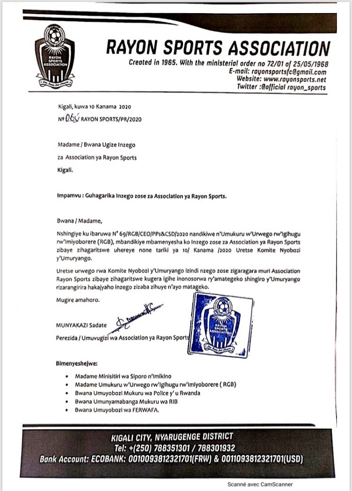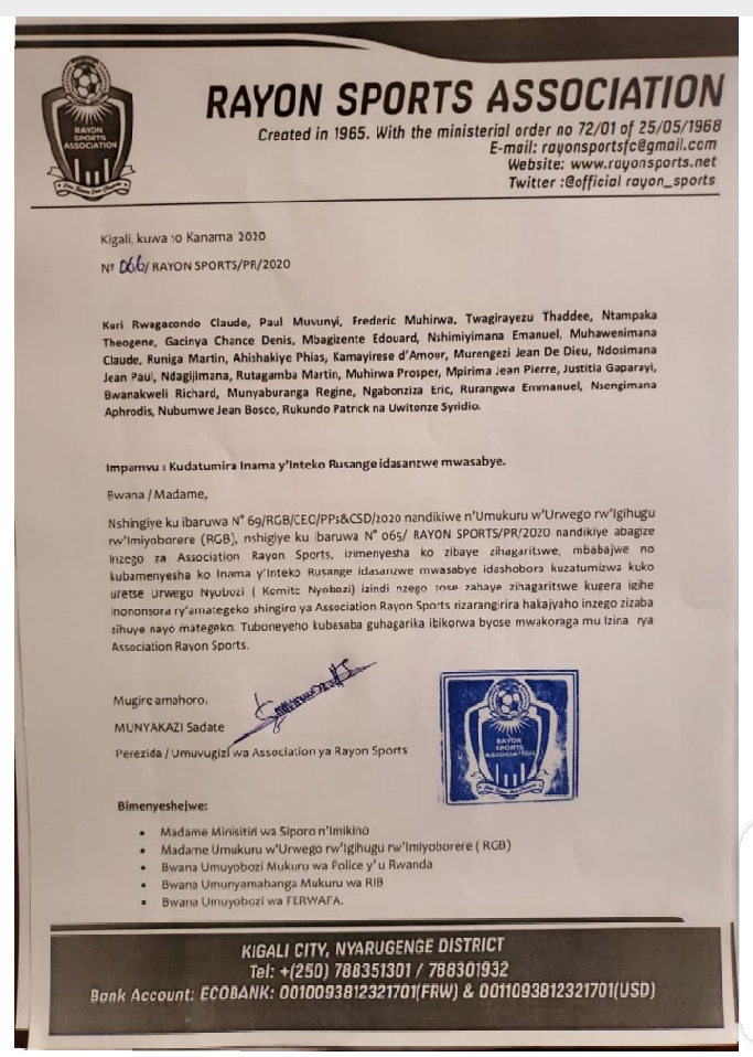 Mu ibaruwa yandikiye abagize izi nzego bose, yabamenyesheje ko inzego zindi zizatorwa nyuma yo kuvugurura amategeko agize umuryango wa Rayon Sports.