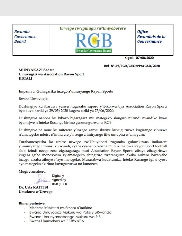 Mu ibaruwa RGB yandikiye Rayon Sports tariki 07/08/2020, uru rwego rw’igihugu rw’imiyoborere rwasabye Munyakazi Sadate guhagarika inzego zose zigize umuryango wa Rayon Sports, anabuzwa gutumiza inama y’inteko rusange kugeza igihe amategeko azavugururirwa.