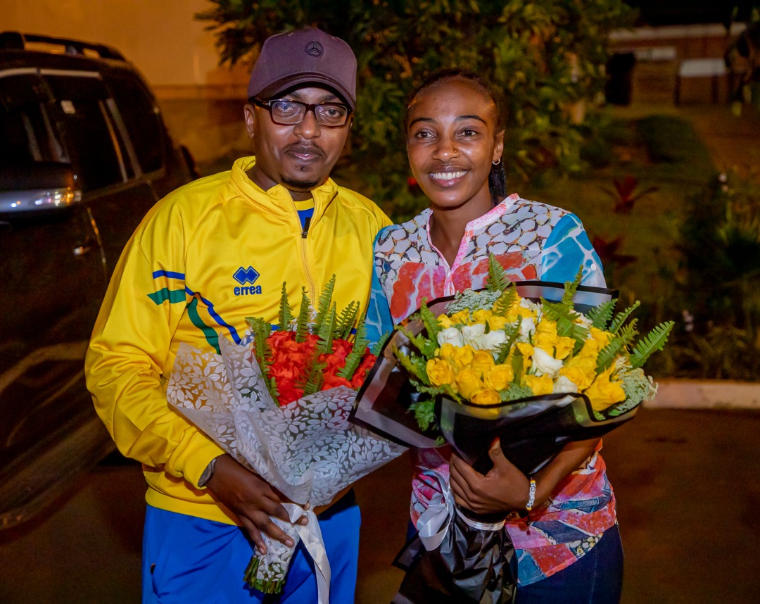 Akigera ku Kibuga Mpuzamahanga cy’Indege cya Kigali i Kanombe, yakiriwe n’Umunyamabanga Mukuru w’Ishyirahamwe ry’Umupira w’Amaguru mu Rwanda (FERWAFA), Muhire Henry Brulart hamwe n’abasifuzikazi bagenzi be barimo Umutoni Aline, Murangwa Usenga Sandrine na Umutesi Alice bari bamuzaniye indabo, yakirwa ndetse n’abo mu muryango we.