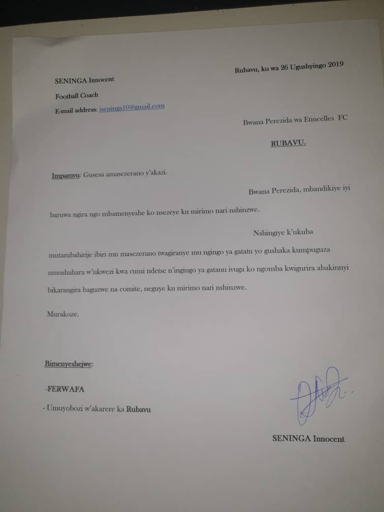 Nk’uko bigaragara mu ibaruwa Seninga yandikiye ubuyobozi bwa Etincelles muri iki gitondo cyo ku wa 26/11/2019, yamenyesheje iyi kipe ko asezeye ku mirimo yari ashinzwe.