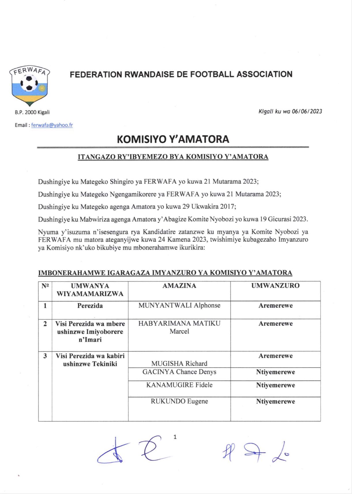Mu rutonde rwatangajwe, Munyantwali Alphonse uyobora ikipe ya Police FC ni umukandida rukumbi ku mwanya wa Perezida. Mu batemerewe kwiyamamaza harimo Gacinya Denis wigeze kuyobora Rayon Sports, akaba yari yatanze kandidatire ku mwanya wa Visi-Perezida.