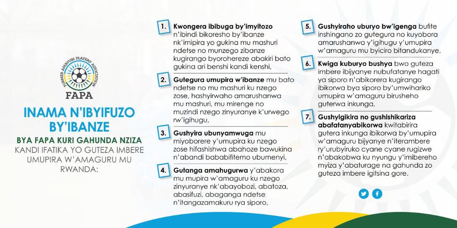 Tubifurije umunsi mwiza wa mbere w'icyumweru gishya mwese! Uyu munsi tubafitiye ingingo ijyanye nikiganiro twifuza ko mwagiramo uruhare. Tubwire icyo utekereza ku nama n'ibyifuzo 7 by'ingenzi by'ibyo twizera ko ari gahunda nziza yo guteza imbere umupira w'amaguru mu Rwanda.👇 pic.twitter.com/Hw403xnfBD