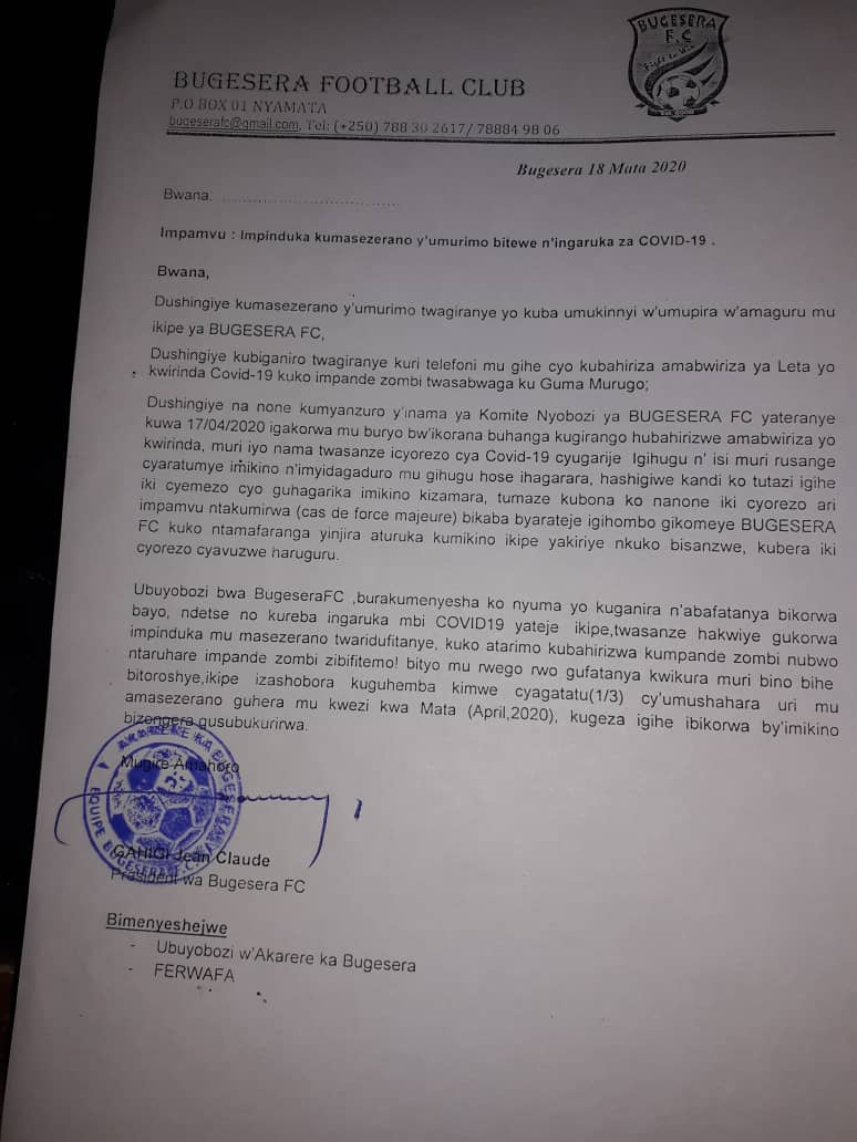Muri iyi baruwa, ikipe ya Bugesera ivuga ko ari umwe mu myanzuro y’inama ya Komite Nyobozi ya Bugesera yateranye Tariki 17/04/2020 hifashishijwe ikoranabuhanga, ndetse n’ibiganiro bagiranye n’abakinnyi.