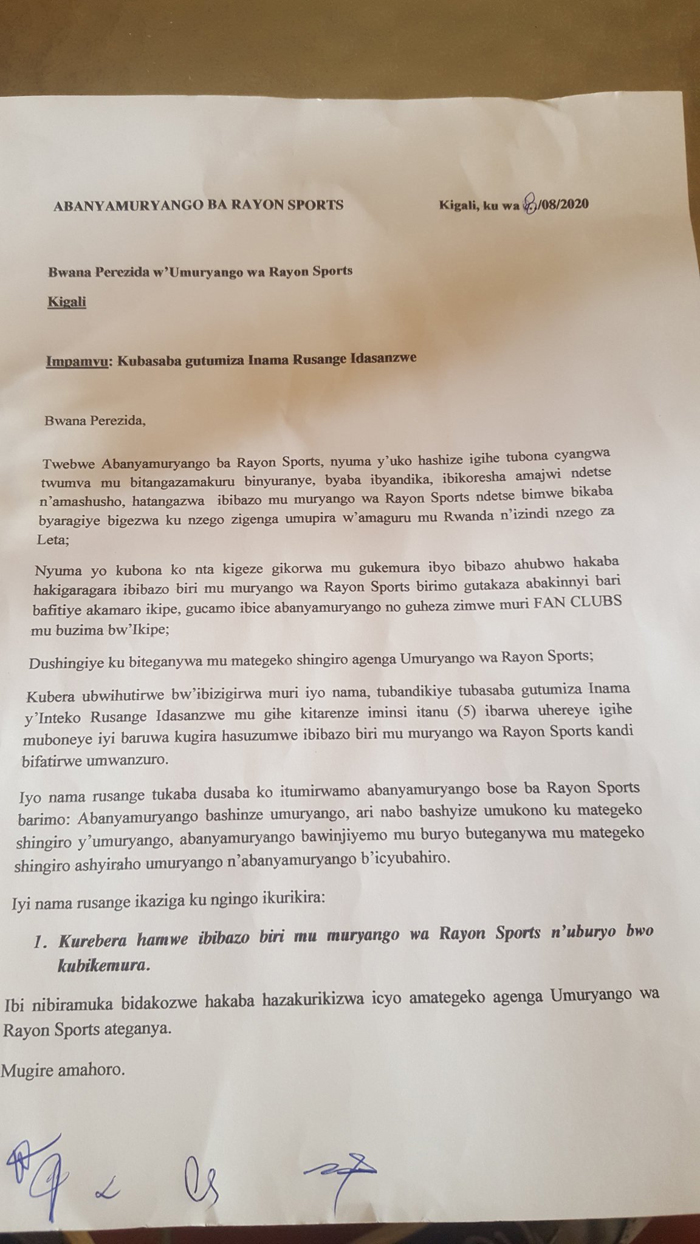 Kuri uyu wa Gatandatu Tariki 08/08/2020 bamwe mu banyamuryango b’ikipe ya Rayon Sports bandikiye Munyakazi Sadate bamusaba gutumiza inteko rusange idasanzwe, aho bavugaga ko biteganywa n’amategeko shingiro agenga umuryango wa Rayon Sports.