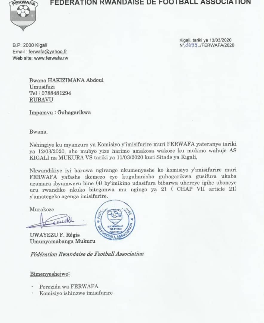 Kuri iki kirego cyo, Ferwafa ishingiye ku myanzuro ya komisiyo y’imisifurire yamenyesheje uyu musifuzi Hakizimana Abddoul wasifuye uyu mukino, ko agomaba ibyumweru bine adasifura uhereye kuri uyu munsi yaboneyeho ibaruwa imuhagarika.