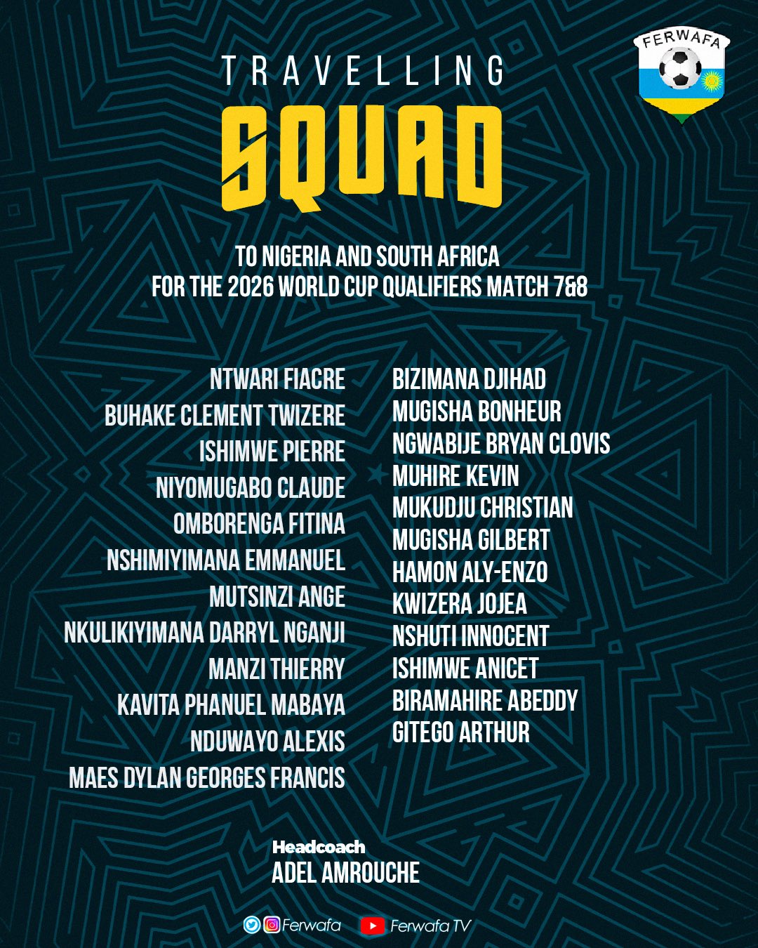 Amavubi azakirwa na Nigeria, ku wa Gatandatu saa kumi nebyiri z’umugoroba mbere y’uko ku Cyumweru afata indege yerekeza muri Afurika y’Epfo aho azakirirwa na Zimbabwe ku wa Kabiri tariki ya 9 Nzeri 2025.