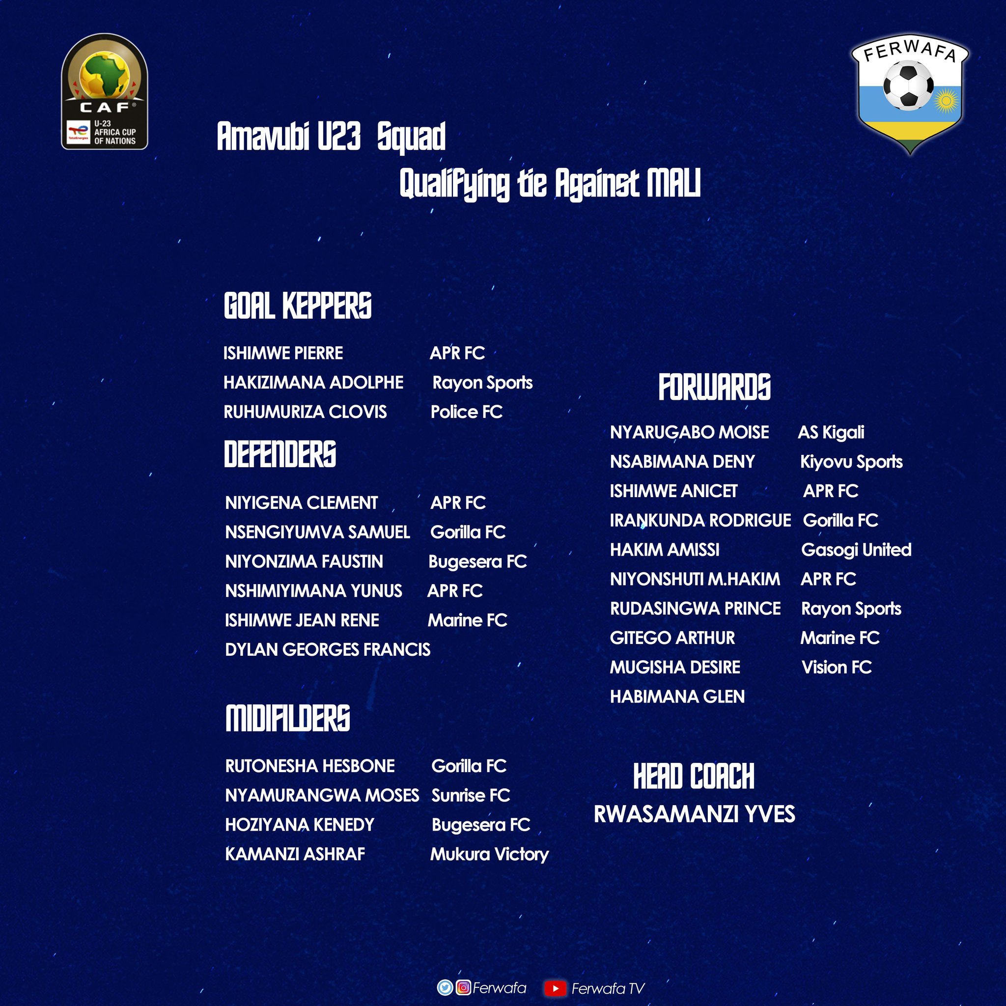 Ikipe y’igihugu y’u Rwanda “Amavubi U23” aratangira umwiherero ku wa Gatanu tariki 14/10/2022 nyuma y’imikino y’umunsi wa gatanu wa shampiyona, mu gihe abakinnyi ba APR FC bazasanga abandi nyuma yo gukina ikirarane tariki 17/10/2022 n’ikipe ya Police FC.