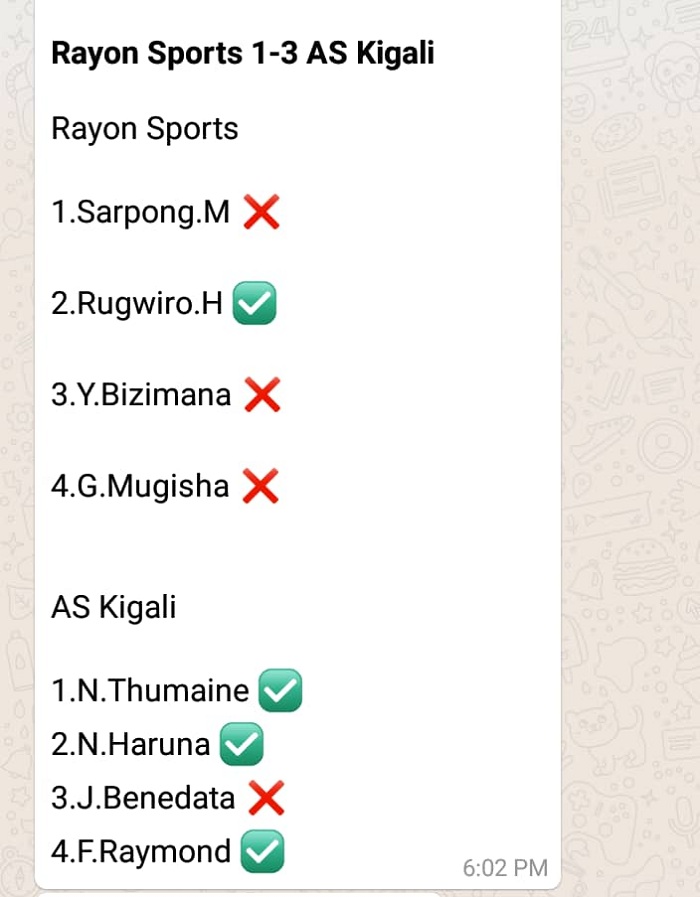 Rayon Sports yaje kwishyura icyo gitego hafi ku munota wa nyuma, gitsinzwe na kapiteni wayo Eric Rutanga, iminota 90 y’umukino irangira amakipe yombi anganya ibitego 2-2, hitabazwa penaliti.