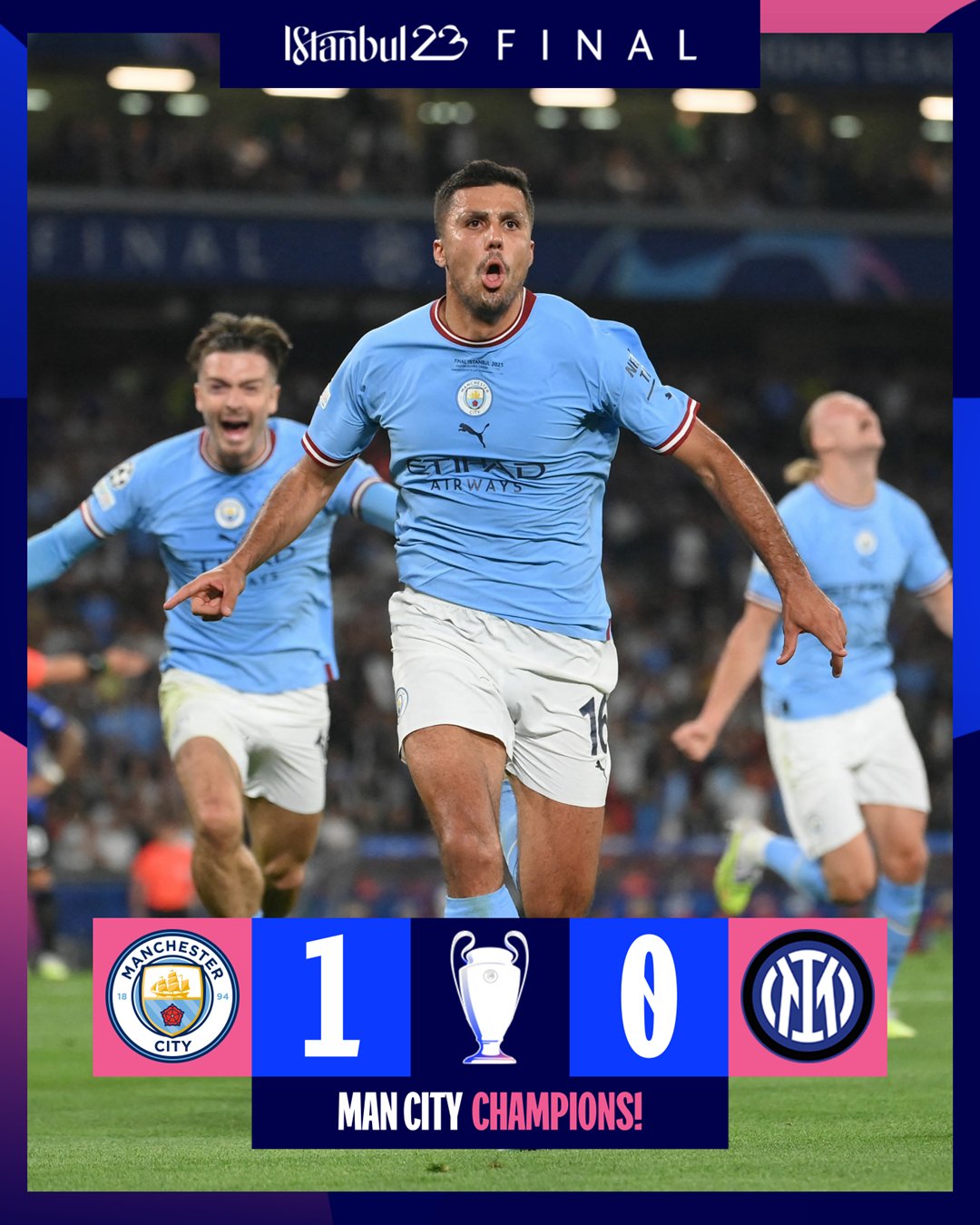 Nyuma yo kubura iki gitego Man City yahise ibona igitego ku munota wa 68 ubwo Bernardo Silva yahinduriraga umupira ku ruhande rw’iburyo imbere ariko ba myugariro ba Inter bakuyeho umupira bananirwa kuwukura imbere y’izamu maze usanga Rodri arebana n’izamu rya Andre Onana ateramo ishoti rikomeye ryavuyemo igitego cya mbere. Nyuma y’iki gitego ikipe ya Inter yashoboraga kwishyura ku munota wa 70 ubwo Dimarco yateraga umupira n’umutwe ugafata umutambiko w’izamu ukagaruka n’ubundi yawushyiraho umutwe ugakurwamo na mugenzi we Romelu Lukaku.