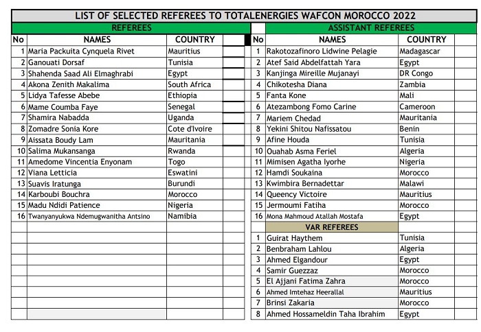 Guhera tariki 02 Nyakanga kugera tariki 23 Nyakanga 2022, mu mijyi ya Rabat na Cassablanca yo muri Maroc, harabera imikino y’igikombe cya Afurika cy’abagore, aho kugeza ubu hamaze gutangazwa urutonde rw’abasifuzi 40 bazagisifura.