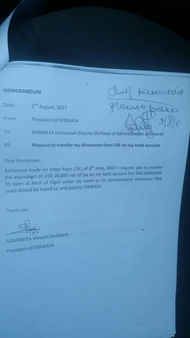 Nk’uko bigaragara muri iyi baruwa Umuyobozi wa Ferwafa ngo yigeneye amafaranga angana na 20 000 $ (ibihumbi makumyabiri) ahwanye na 16 760 000 Frw, aya akaba ari amafaranga yari agenewe Perezida wa Ferwafa mu gihe cy’umwaka w’ingengo y’imari utangira 1/07/2017 kugeza 30/06/2018