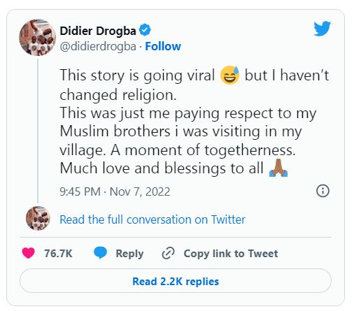 Didier Drogba ariko, mu butumwa yanditse kuri twitter ku mugoroba wo ku wa mbere yagize ati: “N’ubwo inkuru yakomeje gusakara, ariko sinigeze mpindura idini rwose! Cyari igikorwa gisanzwe cyo kwifatanya n’abavandimwe banjye b’Abayisilamu ubwo nari nagiye gusura iwacu ku ivuko.”