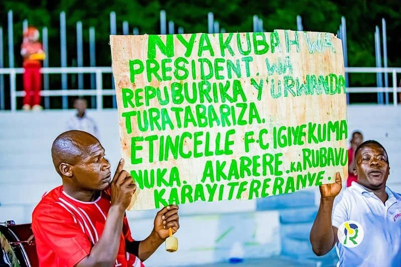 Bimwe mu byapa byasabaga Umukuru w’Igihugu kubaba hafi, kuko Akarere kayitereranye ikaba igiye kumanuka, aya magambo kandi yiyongeraho ayari ku kindi cyapa cyari cyanditseho amagambo asaba Ubuyobozi bw’Intara y’Iburengerazuba, kubabariza Akarere ka impamvu katereranye ikipe.