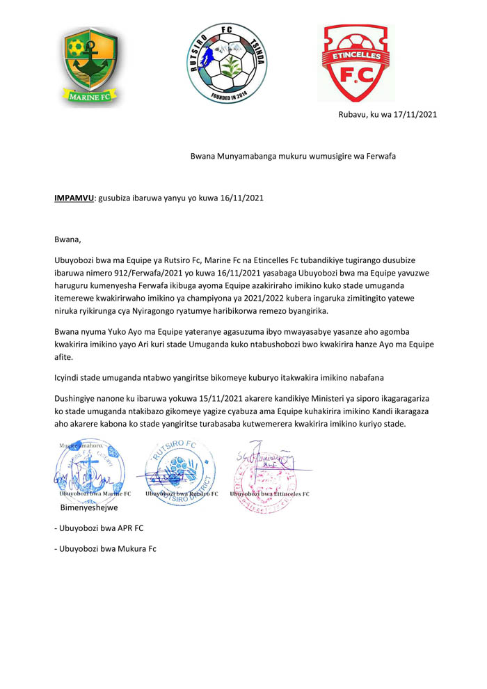 Kuri uyu wa Kabiri taliki 16/11/2021, Ferwafa yandikiye aya makipe atatu iyamenyesha ko ishingiye ku mabaruwa ya MINISPORTS mu bihe bitandukanye, isaba aya makipe gutangaza ibindi bibuga izakiriraho imikino bitarenze uyu munsi tariki 17/11/2021.