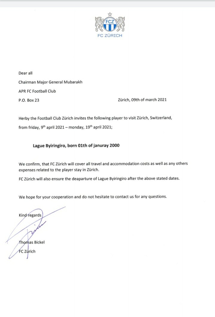 Mu ibaruwa iri gucicikana ku mbuga nkoranyambaga, igaragaza ko ubu iyi kipe ya FC Zürich yandikiye APR FC ibasaba ko bayiha rutahizamu Byiringiro Lague agasura iyi kipe kuva tariki 09/04 kugera tariki 19/04/2021.