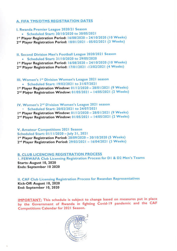 Ferwafa yatangaje kandi ko kwandikisha abakinnyi bazakina shampiyona bizakorwa inshuro ebyiri nk’uko bisanzwe mu mwaka w’imikino, aho inshuro ya mbere abakinnyi bazandikishwa kuva tariki 16/08 kugera tariki 24/10/2020, naho inshuro ya kabiri ikazaba kuva tariki 18/01/2021 kugera tariki 05/02/2021, ibi bikaba ari muri shampiyona y’icyiciro cya mbere mu bagabo.
