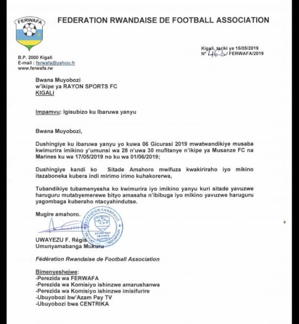 Mu ibaruwa Ferwafa yandikiye Rayon Sports, yabamenyesheje ko ikibuga muri iyi minsi hari indi mirimo iri kuhakorerwa ku buryo icyo kibuga kitaboneka, bityo imikino ibiri bazakiramo Musanze na Marines ikazabera kuri Stade ya Kigali i Nyamirambo.