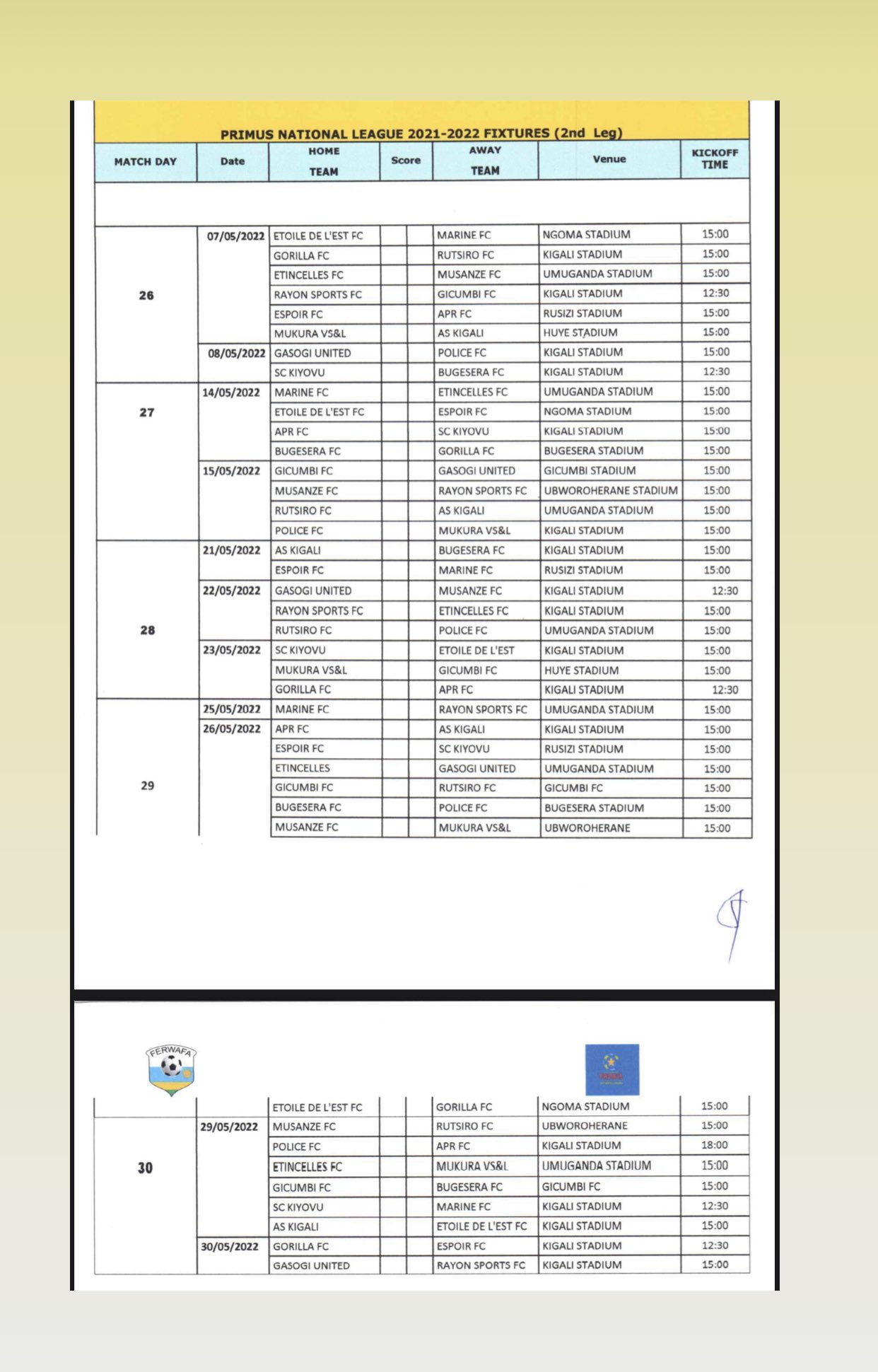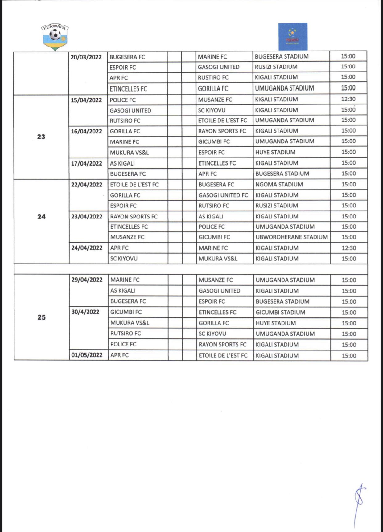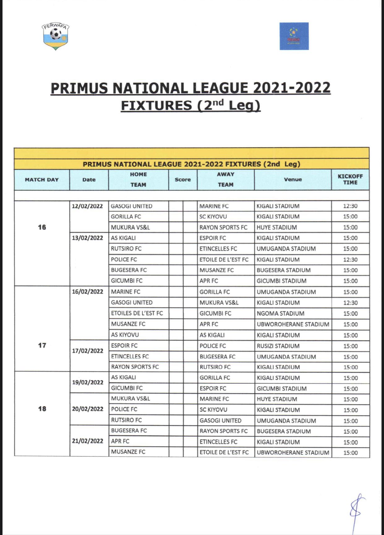 Kuri uyu wa Mbere nk’uko byari byitezwe hatangajwe ingengabihe ya shampiyona y’icyiciro cya mbere mu mupira w’amaguru, aho kuri uyu wa Gatandatu haza gutangira imikino yo kwishyura.