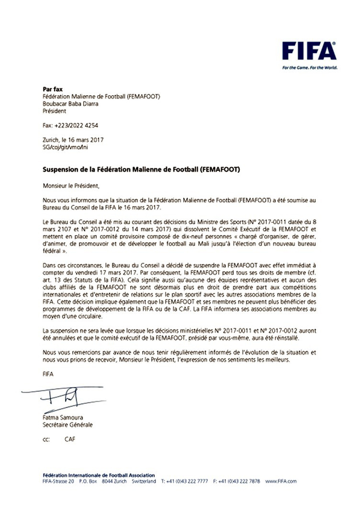 Ibaruwa FIFA yandikiye Federasiyo ya Mali