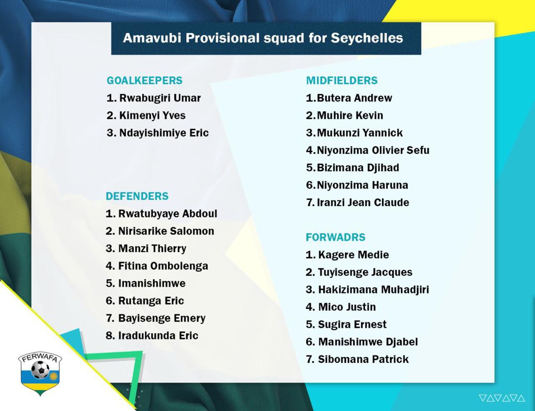 Abakina hanze bahamagawe: Rwatubyaye Abdul (Colorado Rapids, USA), Nirisarike Salomon (FC Tubize, Belgium), Bayisenge Emery (Saif Sporting Club, Bangladesh), Muhire Kevin (Misr El Makkasa, Egypt), Mukunzi Yannick (Sandvikens IF, Sweden), Bizimana Djihad (Waasland Beveren, Belgium), Kagere Meddie (Simba SC, Tanzania), Tuyisenge Jacques (Petro Atletico, Angola), Hakizimana Muhadjiri (Emirates Club, UAE) na Sibomana Patrick (Young Africans).