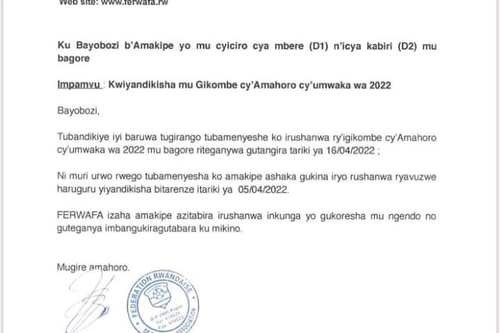 Ibi FERWAFA yabimenyesheje amakipe yo mu cyiciro cya mbere n’icya kabiri mu bagore, binyuze mu ibaruwa yabandikiye.
