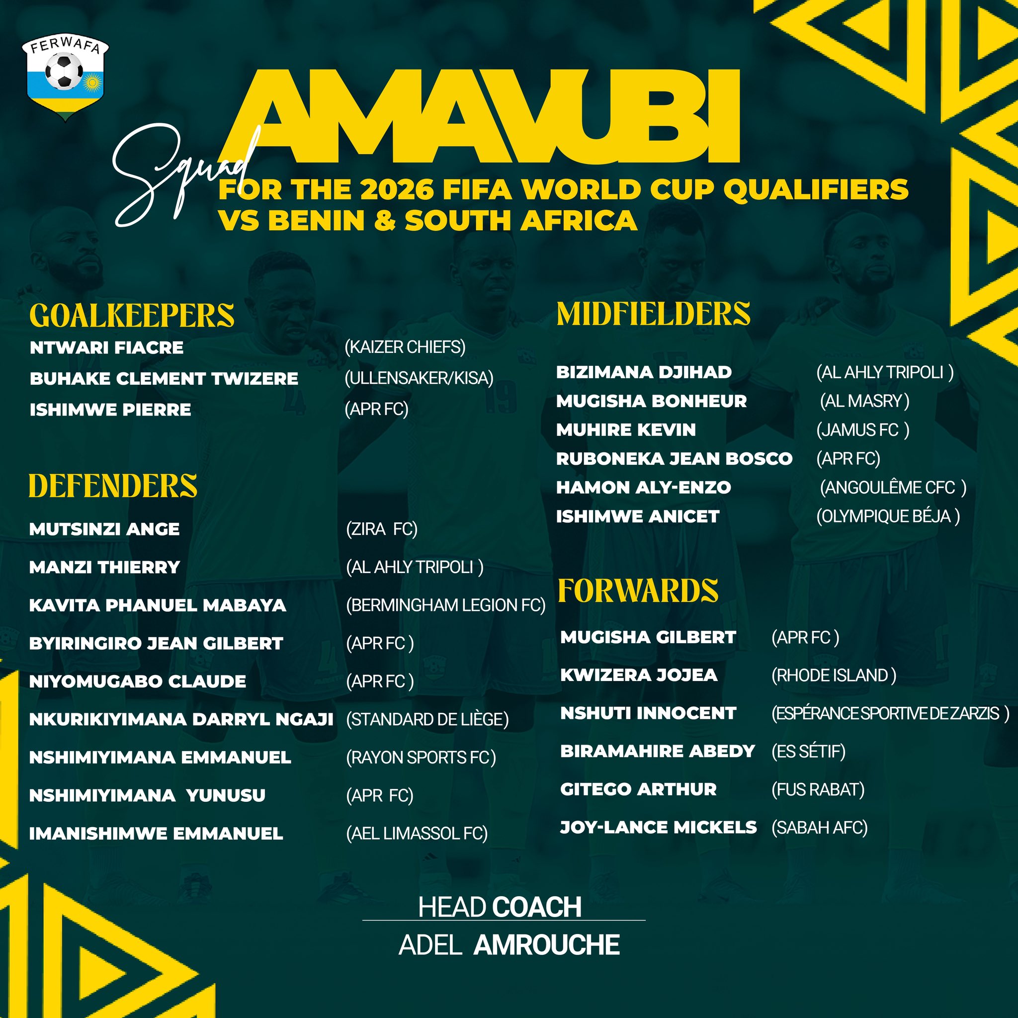 Amavubi azakira Benin tariki 10 Ukwakira 2025, saa kumi n’ebyiri kuri Stade Amahoro mu gihe tariki 14 Ukwakira 2025 azasura Afurika y’Epfo.