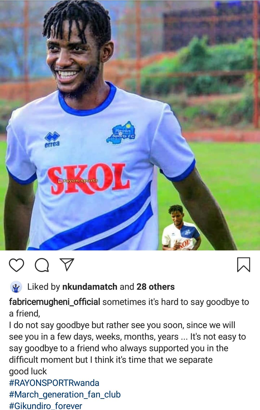 Abinyujije ku rukuta rwe rwa Instagram, Mugheni yanditse amagambo yo gusezera ku ikipe ya Rayon Sports.