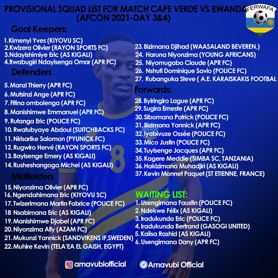 Usibye aba, hari kandi n’abandi bakinnyi bashyizwe ku rutonde rw’agateganyo bashobora kwiyambazwa umunota uwo ariwo wose barimo Usengimana Faustin, Iradukunda Bertrand, Kalisa Rachid, Danny Usengimana na Iradukunda Eric Radu na Ndekwe Felix