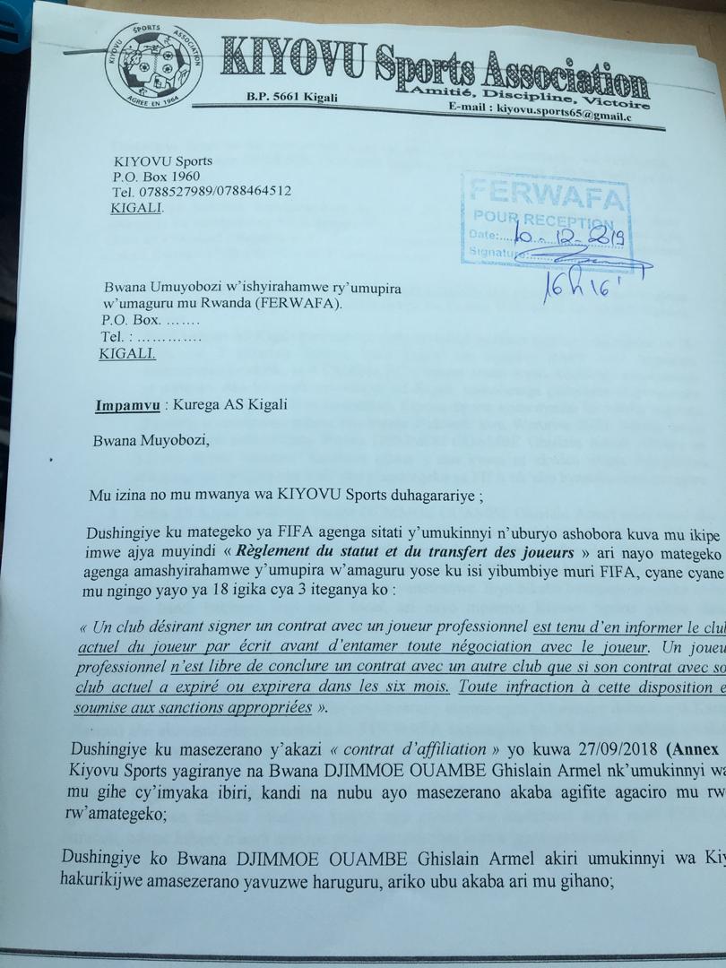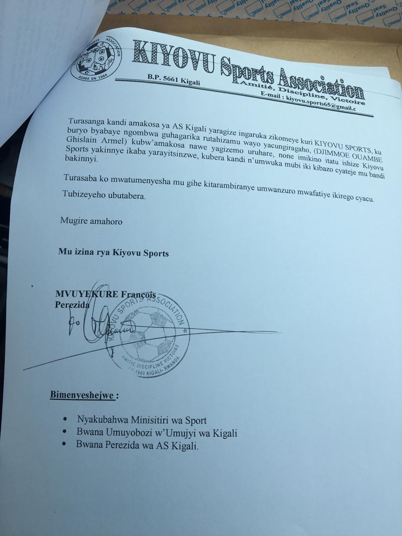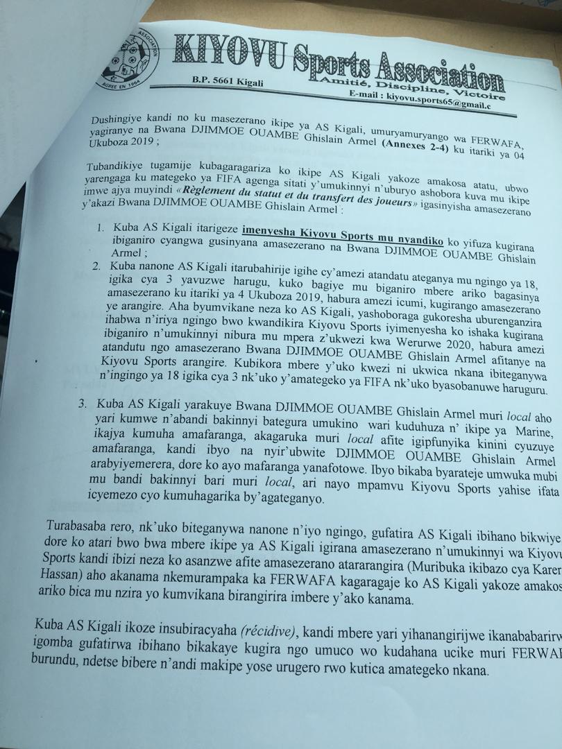 Kuri uyu munsi ni bwo ikipe ya Kiyovu Sports yari yanamuhagaritse yaje kugeza ibaruwa mu ishyirahamwe ry’umupira w’amaguru mu Rwanda Ferwafa, irega ikipe ya AS Kigali ko yishe amategeko agenga igura n’igurisha ry’abakinnyi.