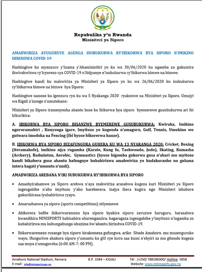 Kuri uyu wa Gatatu tariki 08/07/2020, Minisiteri ya Siporo yatangaje ko hashingiwe ku byemezo by’inama y’abaminisitiri yo ku wa 30 Kamena 2020, hafunguwe icyiciro cya kabiri cy’imikino yari yarahagaze kubera icyorezo cya Coronavirus.
